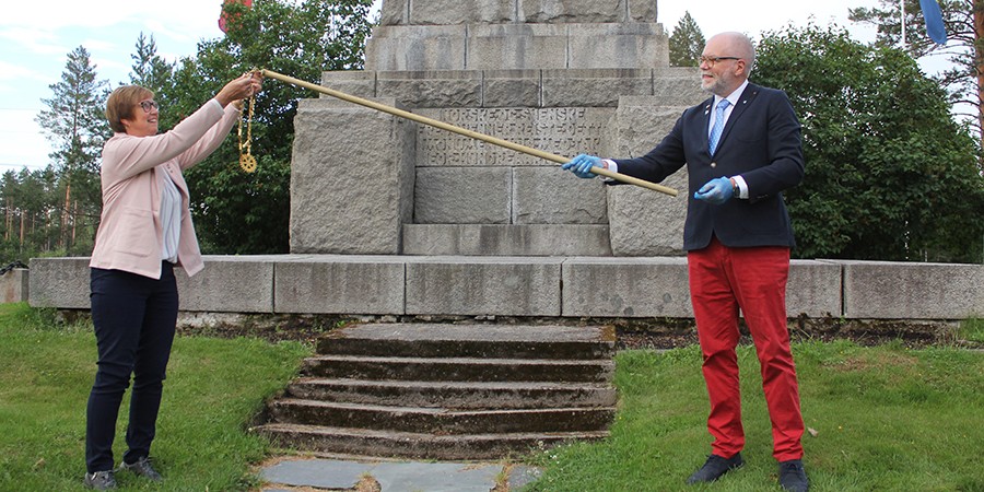Presidentskiftet måtte derfor gjennomføres i to land. Medlemmene møttes ved grensen, foran fredsmonumentet som ble reist i 1914, på hundreårsdagen etter freden mellom våre to land.
