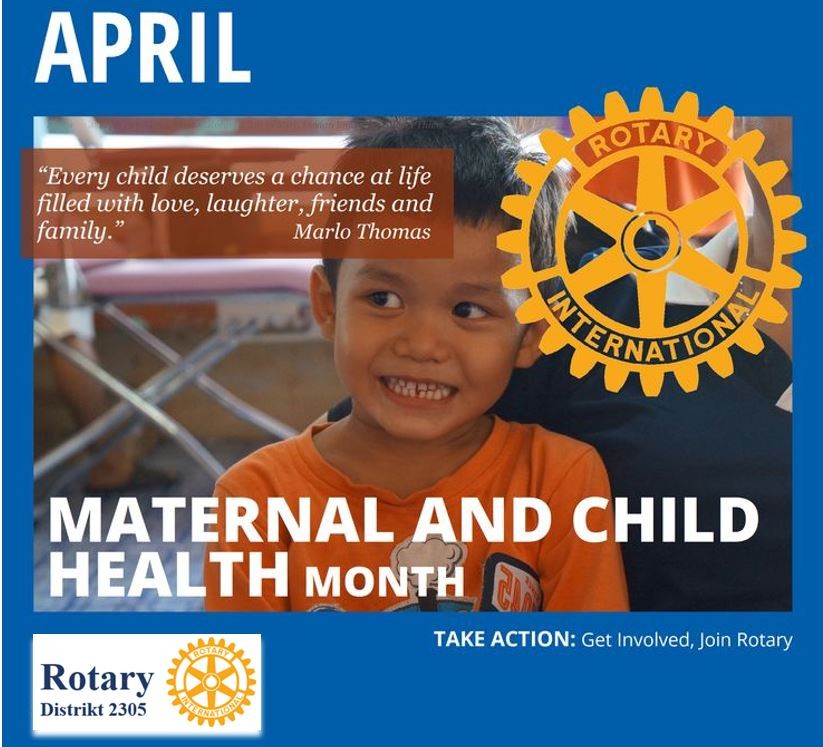 Rotary Internationals tema for april måned er mødre- og barnehelse. Hver dag risikerer mødre livet ved å føde, og millioner av barn dør hvert år av årsaker som kan forebygges. Rotary driver en rekke prosjekter som forbedrer helsesituasjonen i mange land.